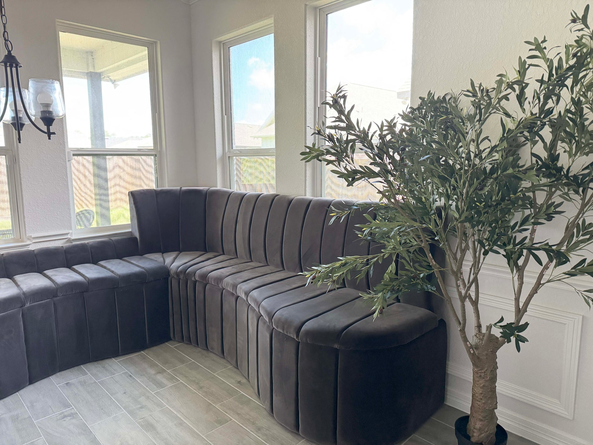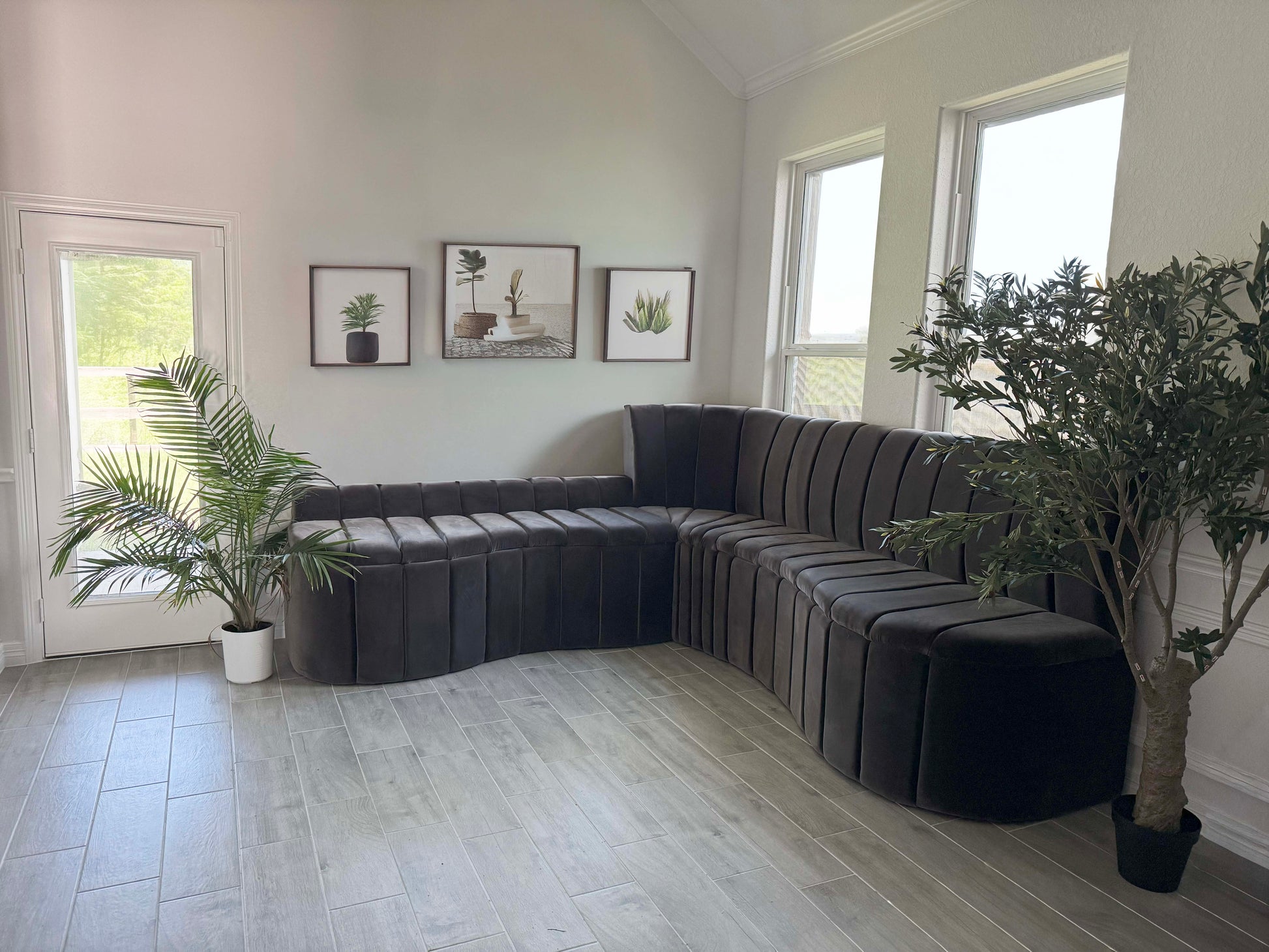 Curved L-Shaped Layout – Maximizes seating and fosters natural conversation flow.